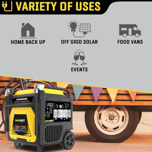 Maxwatt® digital inverter generators offer the best in portable power, fuel efficiency and are super silent. Besides the electrical output being able to power all sensitive equipment, the MX9000IS is ideal for Food trucks, Coffee vans, Markets and events as well as emergency home back up power. This generator has a rated output of 8200 watts with a maximum output of 9000 watts. The MX9000IS has been designed to complement off-grid solar power systems as it has a pre-installed 2-wire automatic start, run and stop control system.