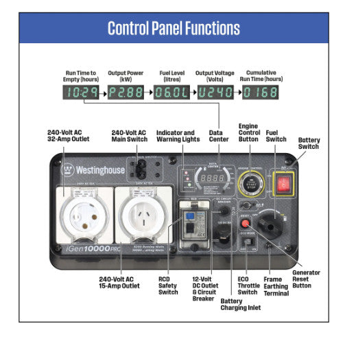 The new iGen10000PRO is the largest Westinghouse inverter generator with an inbuilt RCD electrical safety switch approved for workplace use. It is ideal for standalone plug and socket connection to large or multiple items of portable electric equipment. The benefits of compact size, light weight, low fuel consumption, quiet running and mains quality power are now available for 8 kVA class applications instead of using a traditional fixed-speed generator.